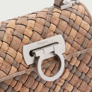 Impulsionada pela pesquisa de materiais responsáveis, a bolsa “Earth Top Handle”, da Salvatore Ferragamo, é feita de cortiça certificada FSC, um recurso natural e renovável que não causa danos às árvores quando colhida.