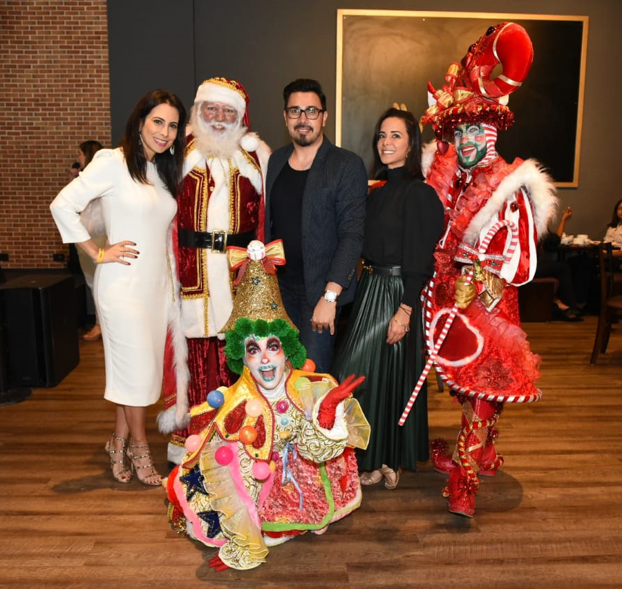 A empresária Melissa Gontijo, o Papai Noel, o diretor de conteúdo do portal Hendy Miranda, a gerente de marketing Maíra Garcia e os personagens da Posers HT no almoço para apresentação do Natal Taguatinga Shopping 2019