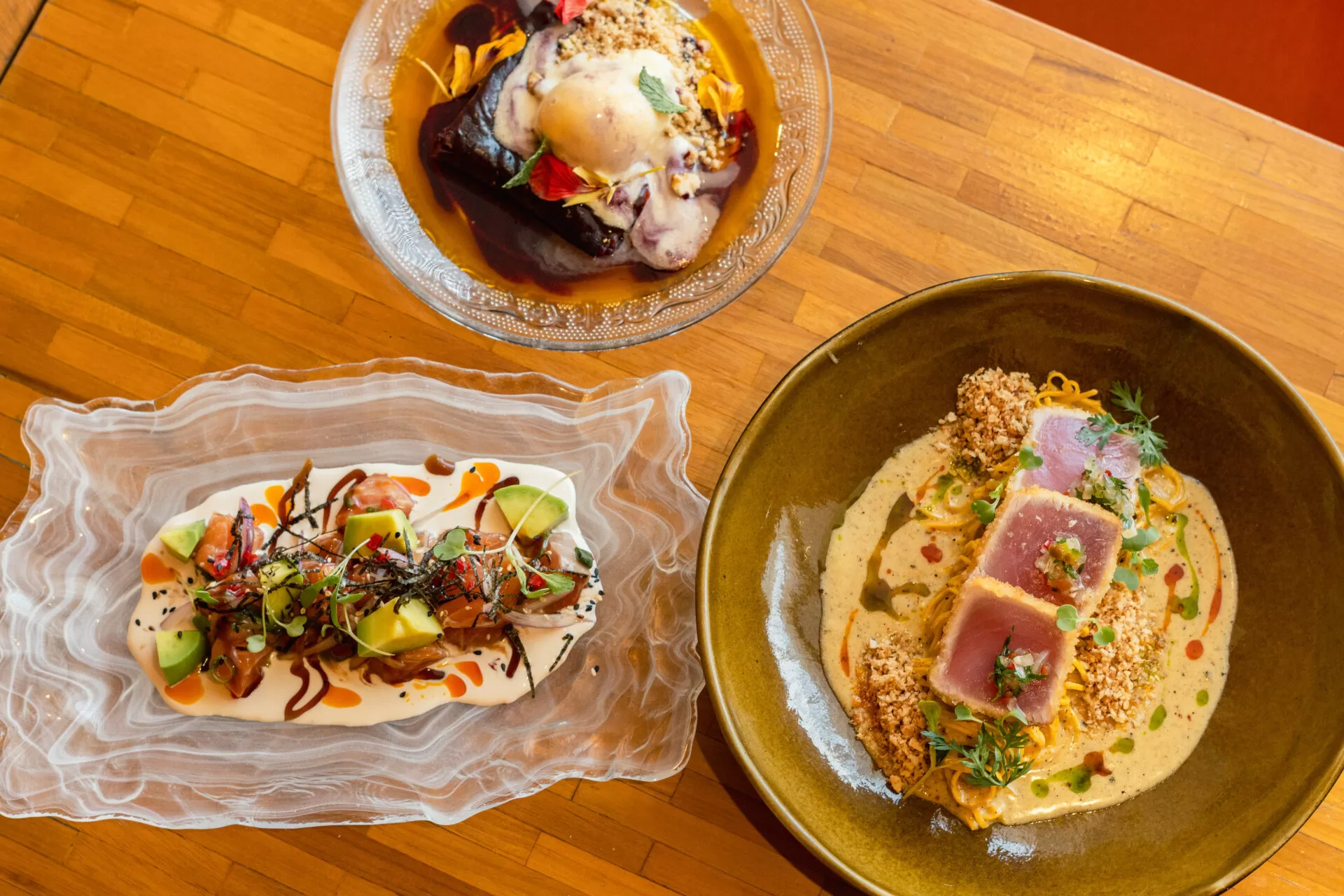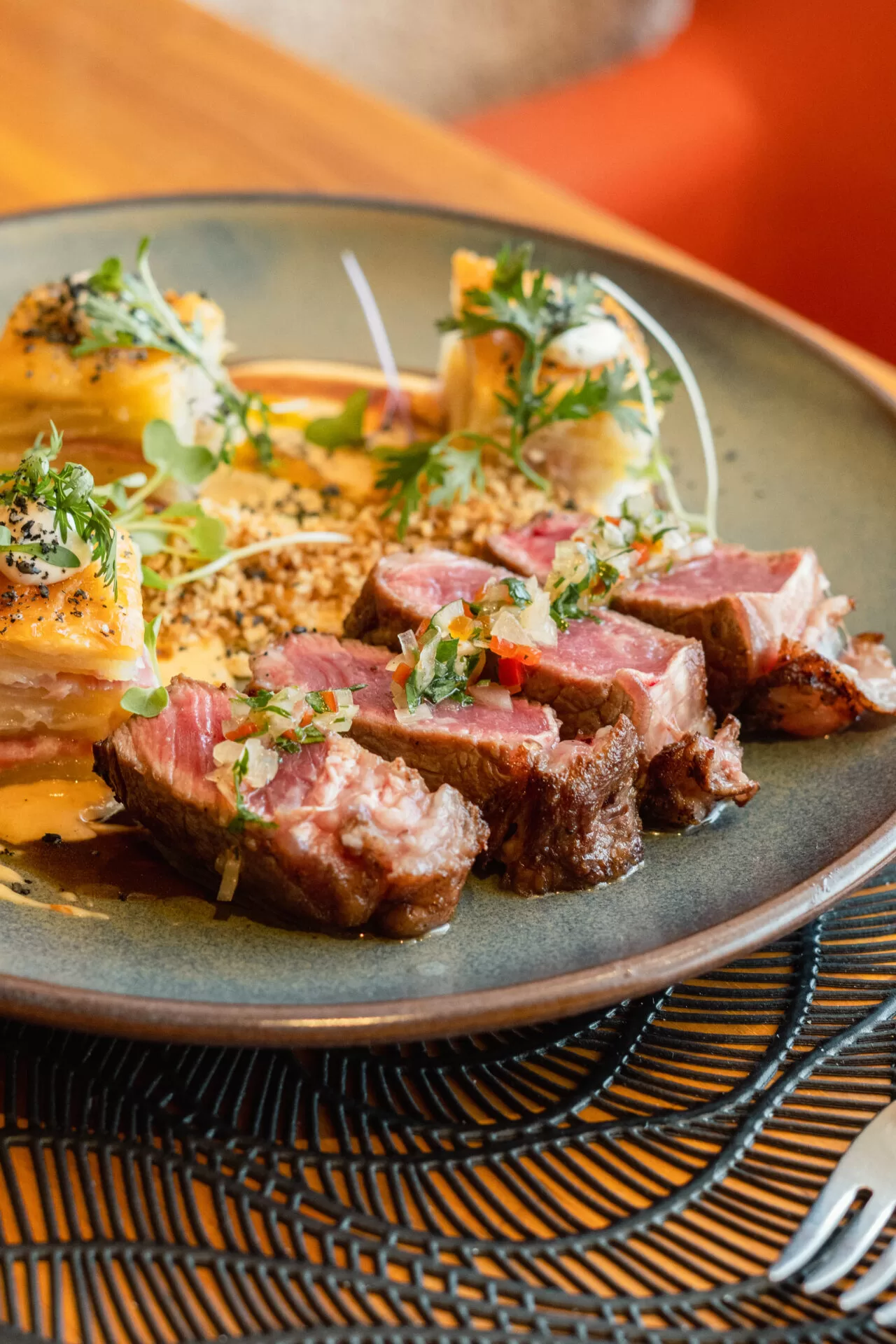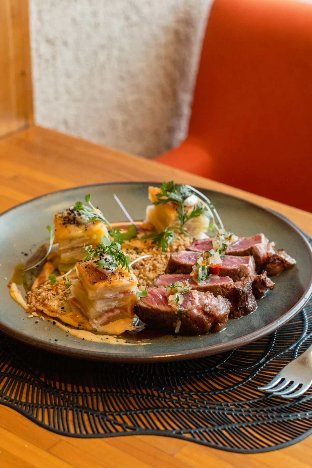 As opções de prato principal são diversas — bife de chorizo grelhado com molho de fonduta apimentada e mil folhas de batata, cebola e bacon; Cacio e Pepe Criollo, com atum mal passado com capelini e molho cacio e pepe com pimenta amarela; ou canelone de mix de cogumelos e abobrinha com molho ao pesto cremoso.