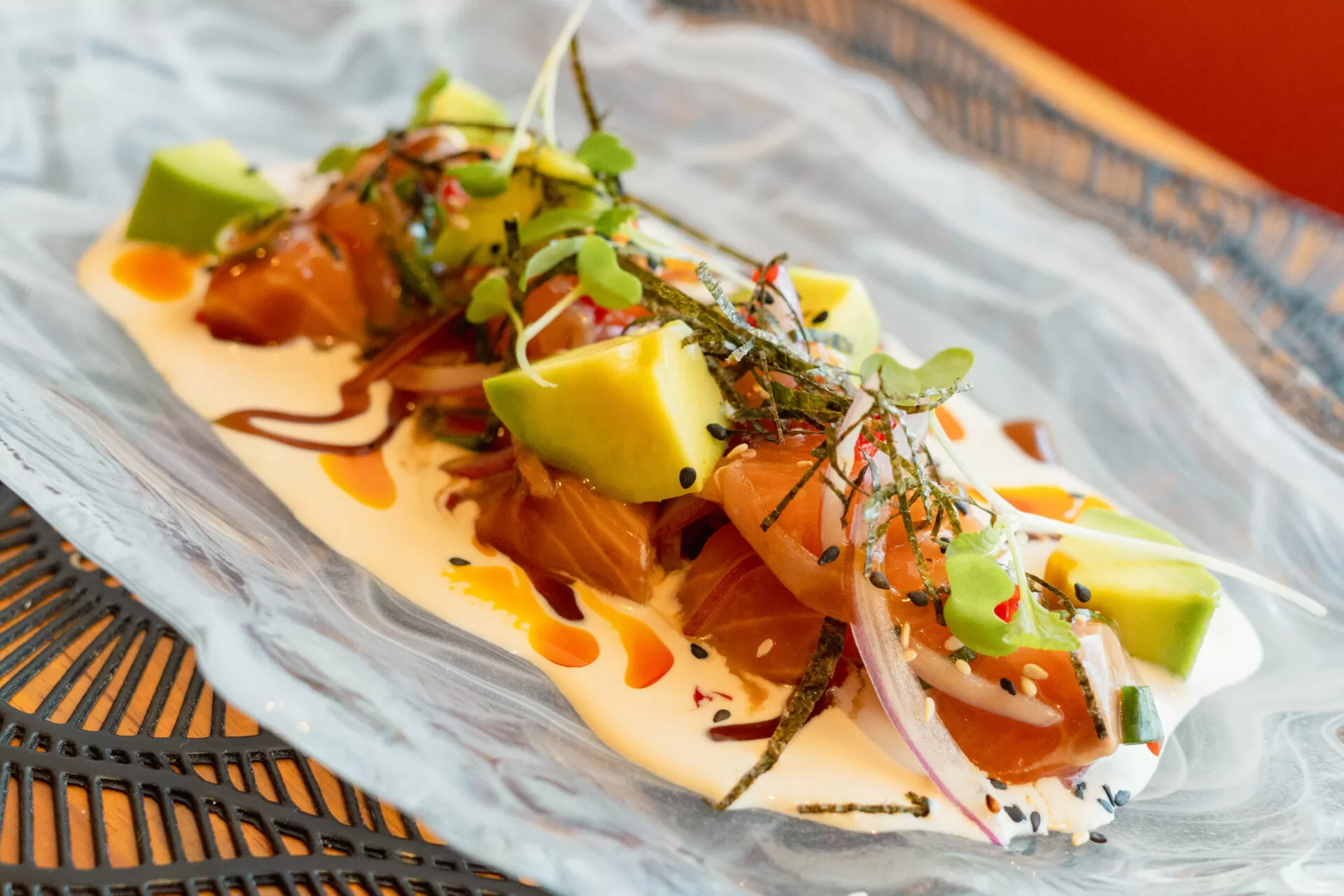 Para começar, a experiência inclui um couvert com pão e manteiga da casa. Em seguida, o cliente pode escolher entre dois tipos de entrada: salpicão de camarão ou Ceviche Nikkey (salmão fresco, teriyaki, molho de ostras, leite de coco, abacate e leite-de-tigre).