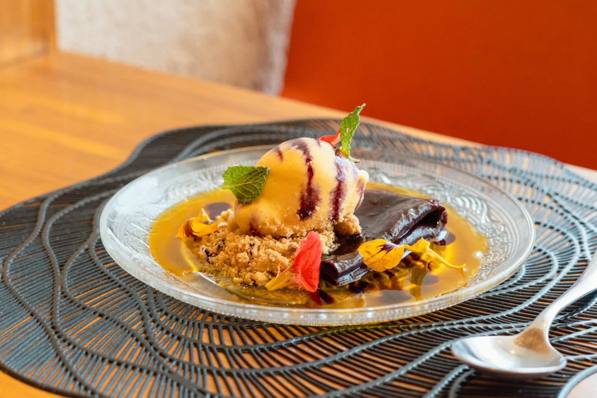 Para encerrar a refeição em grande estilo, a sobremesa é um crepe de milho roxo com molho suzette e sorvete de creme. As opções do menu são renovadas aproximadamente a cada 15 dias.