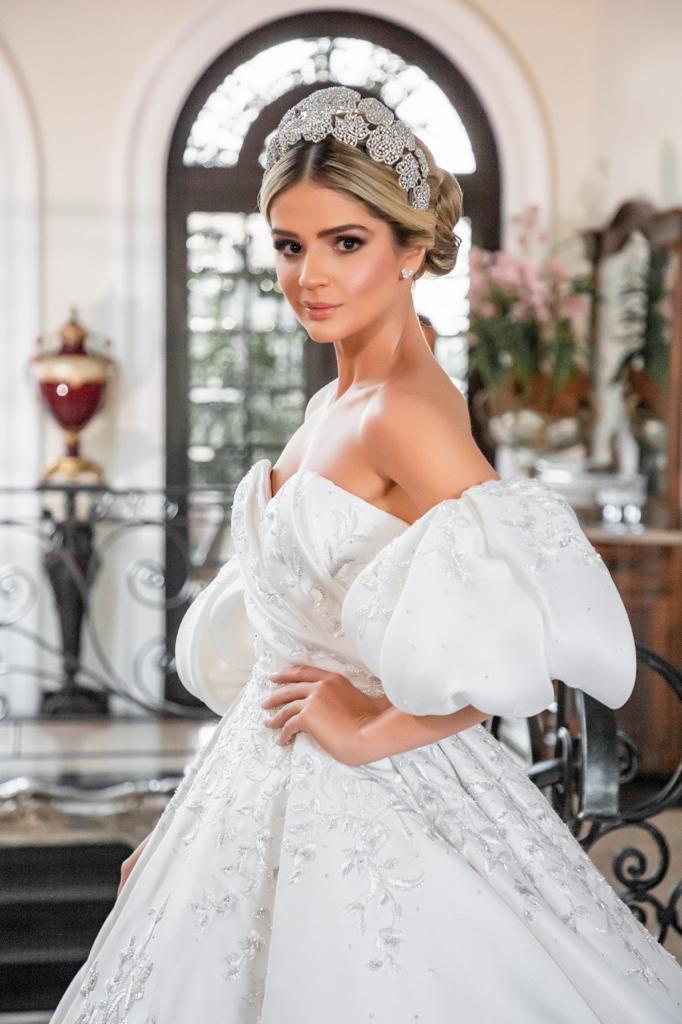A peça de alta costura levou dez meses para ser produzida e carrega um monograma com a história do casal, bordado em linho e cristais no tecido. A jovem arrematou o look com uma tiara de diamantes, feita sob medida pela joalheria mineira Talento Joias.