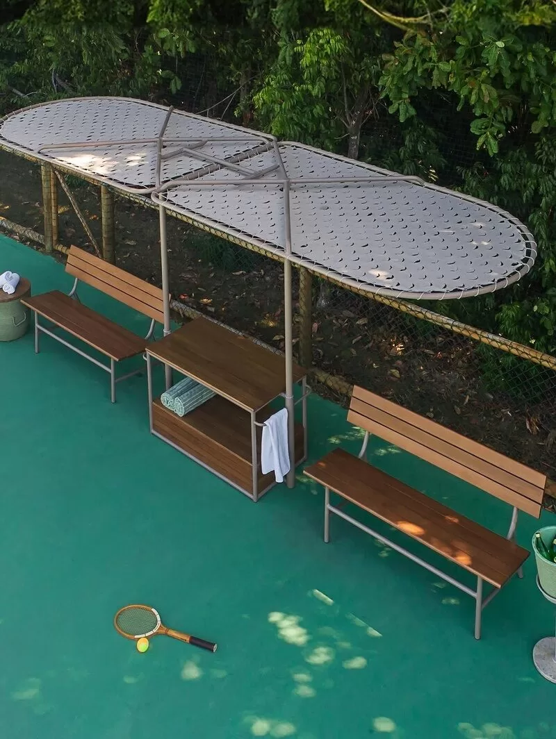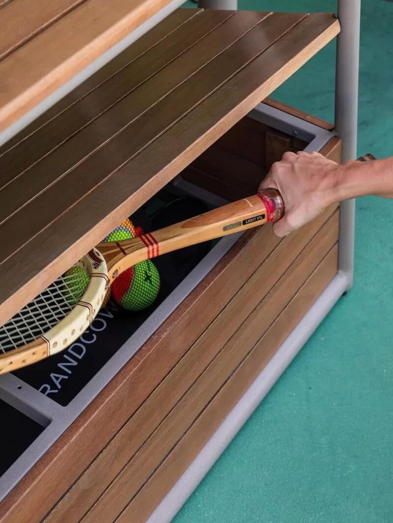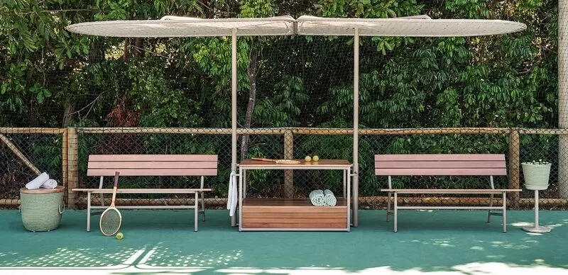 Assinado por Luciano Mandelli, o Apoio de Quadra Monte Carlo traduz o conceito esportivo e elegante da linha em uma peça multifuncional. Com estrutura em alumínio, cobertura em tecido com trama de cordas e baú em madeira para armazenamento, o móvel integra sombra, apoio e organização em um único elemento. O conjunto é complementado por bancos com assento e encosto em ripas de madeira, equilibrando conforto, resistência e estética contemporânea — atributos que reforçam o papel do design na qualificação dos espaços esportivos.