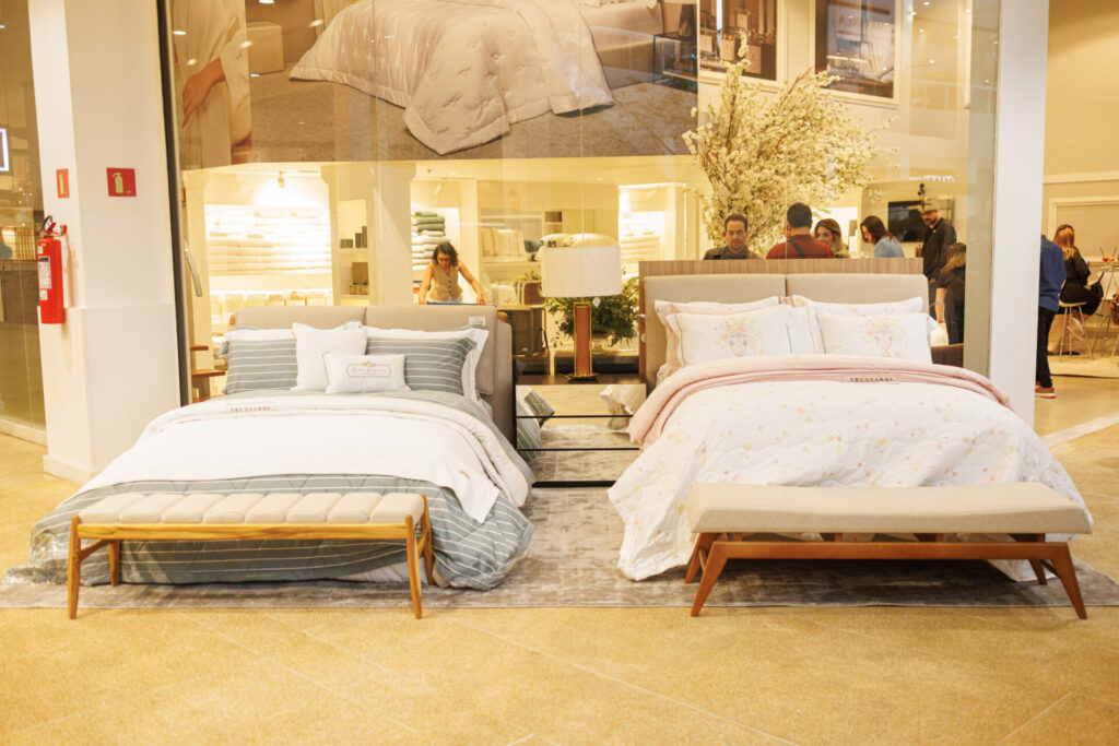 Entre os destaques está o jogo de cama Rivus, que traduz a busca contínua pela sofisticação através do linho, uma fibra nobre conhecida por sua leveza, atemporalidade e propriedades antibacterianas. O linho, altamente absorvente, permite que a pele respire, sem reter umidade, oferecendo frescor e elegância natural. A cama Rivus exibe um design clássico com tons neutros, complementados por um delicado entremeio bordado, criando um equilíbrio perfeito para o quarto.
