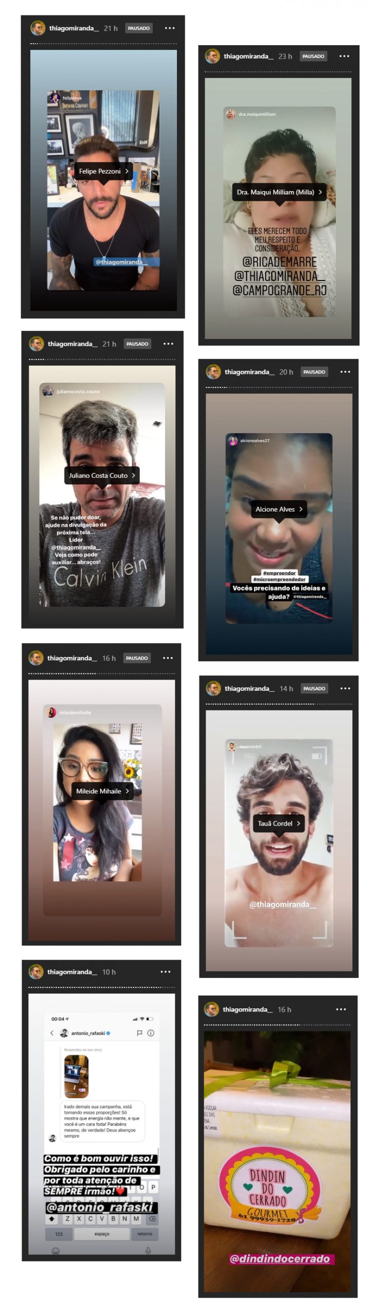 Thiago gravou vídeos pedindo a todos que tivessem interesse, podem enviar prints da sua empresa contando a história e o que estavam precisando de apoio que ele vai dar dicas e divulgar para seus 171k de seguidores no instagram.