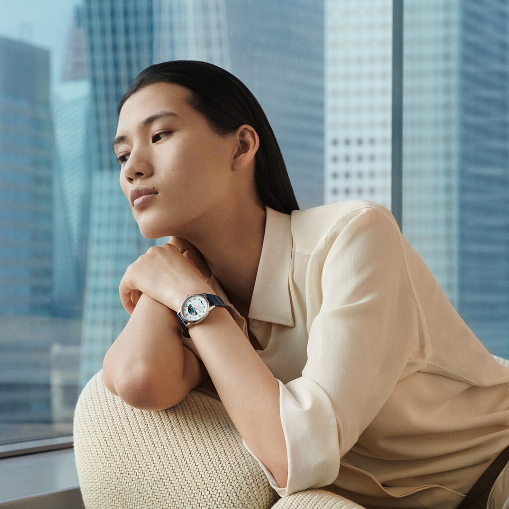 Estilo elegante e funcionalidade se encontram no relógio Montblanc Bohème Day & Night 30 mm, que apresenta nuvens em madrepérola e um disco dia e noite que indica o dia utilizando diferentes gradientes de céu azul e raios de luz. O relógio é completado com índices florais e de diamantes revestidos em ouro rosa, fundo de safira e pulseiras de couro intercambiáveis.