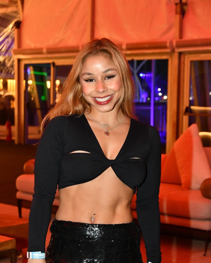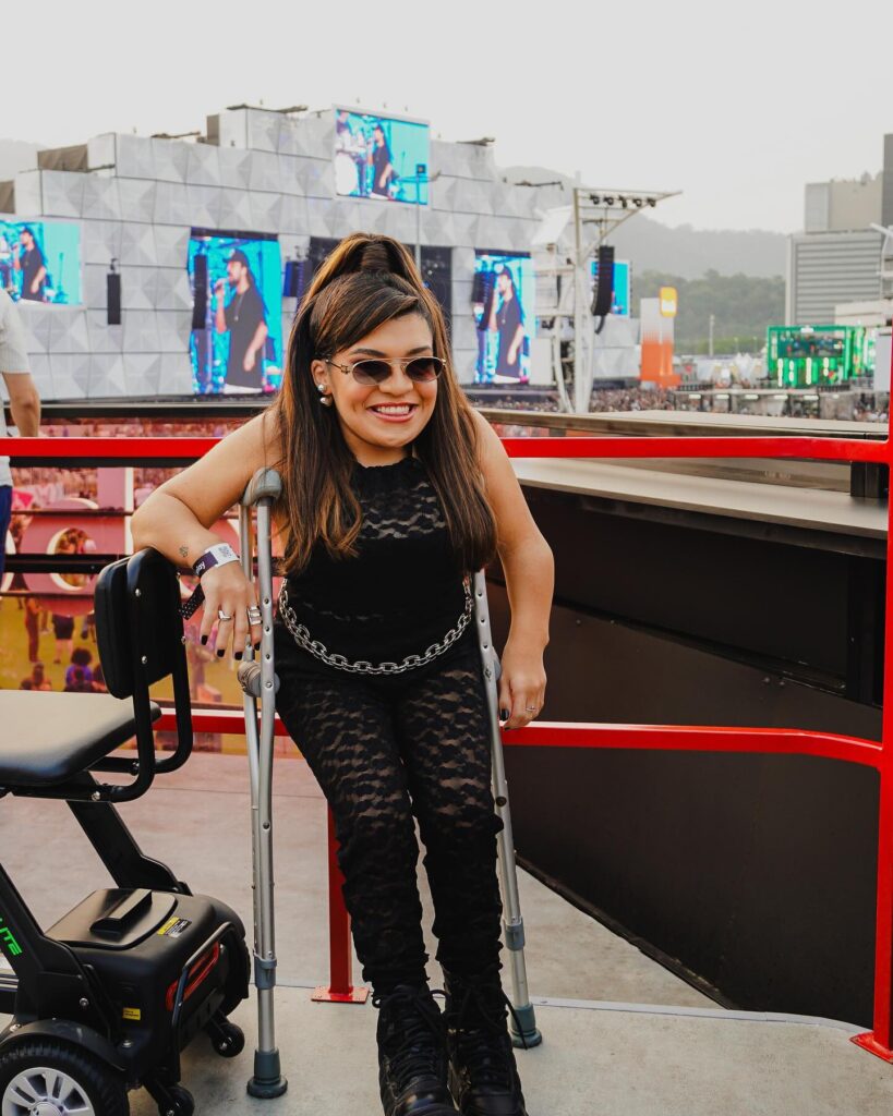 A influenciadora Pequena Lô optou por um look preto ousado, saindo do convencional dela e como ela mesma disse que começou básica para sentir o clima do festival — Foto: Reprodução/Instagram