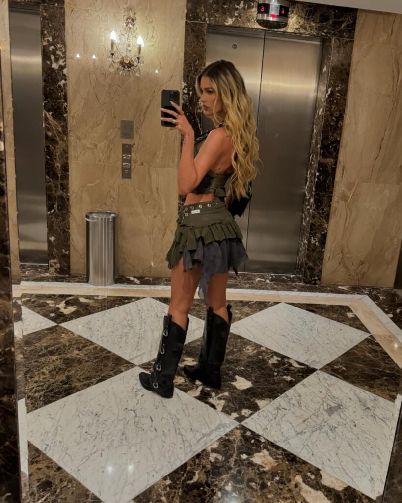 A atriz que foi toda brilhante para o festival mostrou seu look ousado com um jaqueta prateada, um top pretinho com uma bota que ela usou nas gravações do filme que protagonizou com co Lucas Lucco, e ela mesmo disse que prefere o “Conforto” — Foto: Reprodução/Instagram
