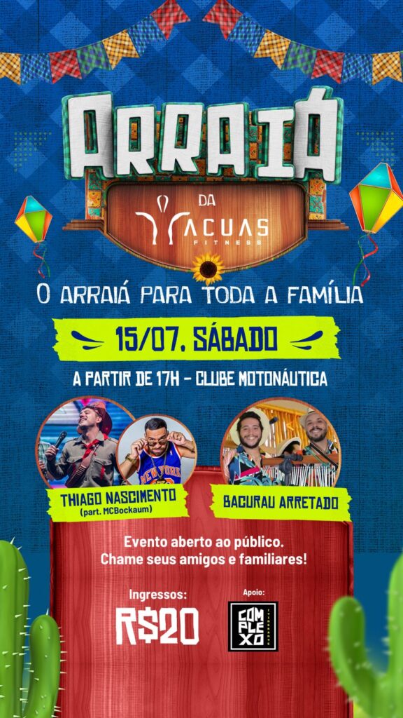 No sábado, 15/07, a partir das 17h no Clube Motonáutica (Beira Lago), acontecerá o Arraiá Acuas Fitness com uma programação exclusiva. A festa aberta ao público começa com DJ às 17h; Trio Bacurau Arretado às 18h; DJ às 19h30; Thiago Nascimento (Projeto São João do Nascimento) – part. MC Bockaum às 20h30 e DJ às 23h.