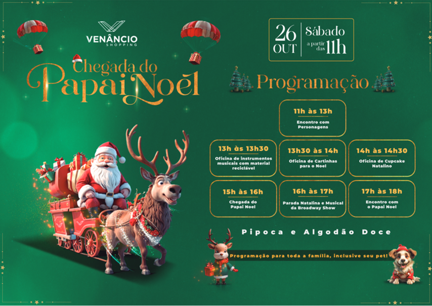 Às 16h, as luzes se acendem e o espírito natalino ganha vida com a grandiosa Parada Natalina, um espetáculo encantador realizado pela Broadway Show trará música, dança e personagens inesquecíveis em um show de magia e alegria, marcando oficialmente o início da temporada de Natal no Venâncio Shopping. E depois, às 17h, Papai Noel assume seu trono mágico, pronto para receber as cartinhas e tirar fotos com as crianças. Durante todos os sábados de novembro, das 12h às 14h, a criançada poderá visitar o bom velhinho no Piso Térreo.