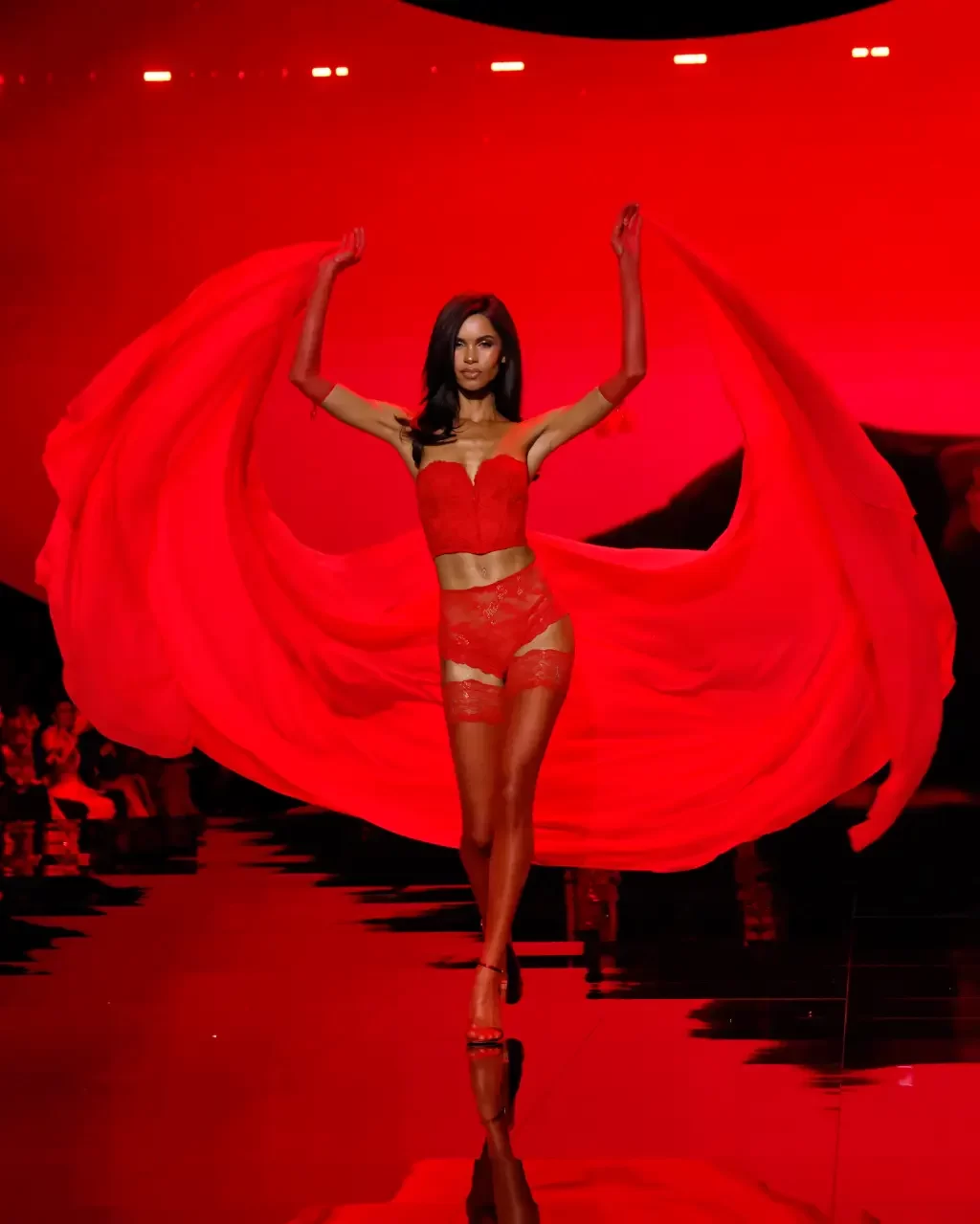 O desfile foi marcado por momentos de forte emoção e grandes reencontros. Bella Hadid fez sua primeira aparição profissional após o tratamento da doença de Lyme, sendo recebida com entusiasmo pela plateia. Candice Swanepoel brilhou em duas entradas, abrindo o show e retornando no final em um look preto que remeteu à era de ouro das angels. A modelo Anok Yai encantou com um visual cintilante, e a atleta Angel Reese fez história ao se tornar a primeira esportista profissional a desfilar pela marca, usando lingerie rosa e as asas tradicionais.