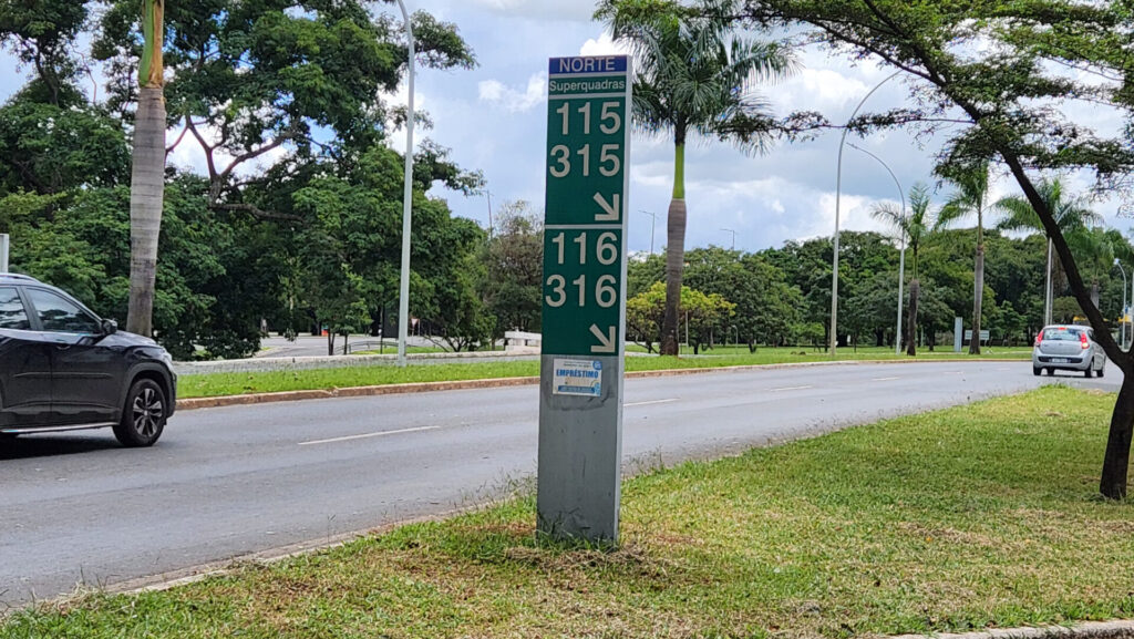 As verdes são as mais vistas, alinhadas ao lado das vias principais. Elas apontam o caminho a seguir, sempre acompanhadas por setas que indicam direções. Já as azuis ficam estrategicamente localizadas nas superquadras, indicando o local onde se está. As placas marrons indicam pontos turísticos e foram feitas para a Copa do Mundo de 2014.