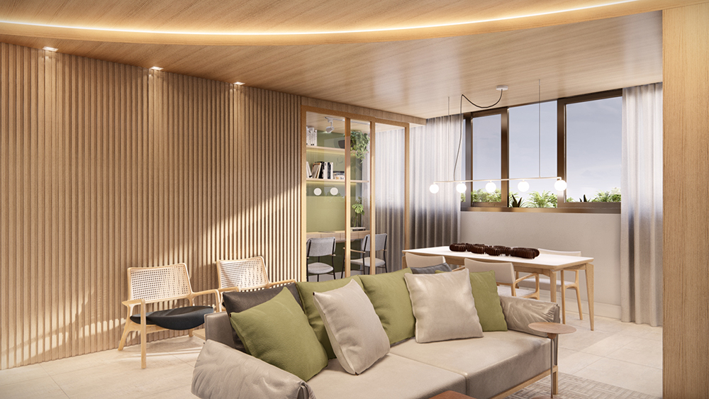 O nome do projeto Ver de cá parte do conceito de trazer o verde para o lado de dentro do espaço, aproximando os moradores da natureza e ressignificando o novo morar. Com o estreitamento das relações interpessoais, o escritório de arquitetura Domenech & Mosquéra criou um espaço que permite conviver de forma integrada e, ao mesmo tempo, reservada, como é o caso do home office e o espaço de descompressão.