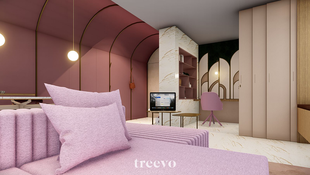 As referências arquitetônicas e decorativas recolhidas ao longo de várias visitas a Paris aliadas às memórias afetivas de uma arquiteta, uma fotógrafa e uma psicóloga são os pontos de partida para o espaço Coliving c’est la vie, do Studio Treevo. A essência se dá na paleta de cores monocromática que traz um vermelho aveludado com subtom avioletado e suas nuances mais suaves que se estendem por todo o ambiente em contrapontos de tons dourado, sépia e baunilha proporcionando sensação de aconchego, acolhimento e energia.