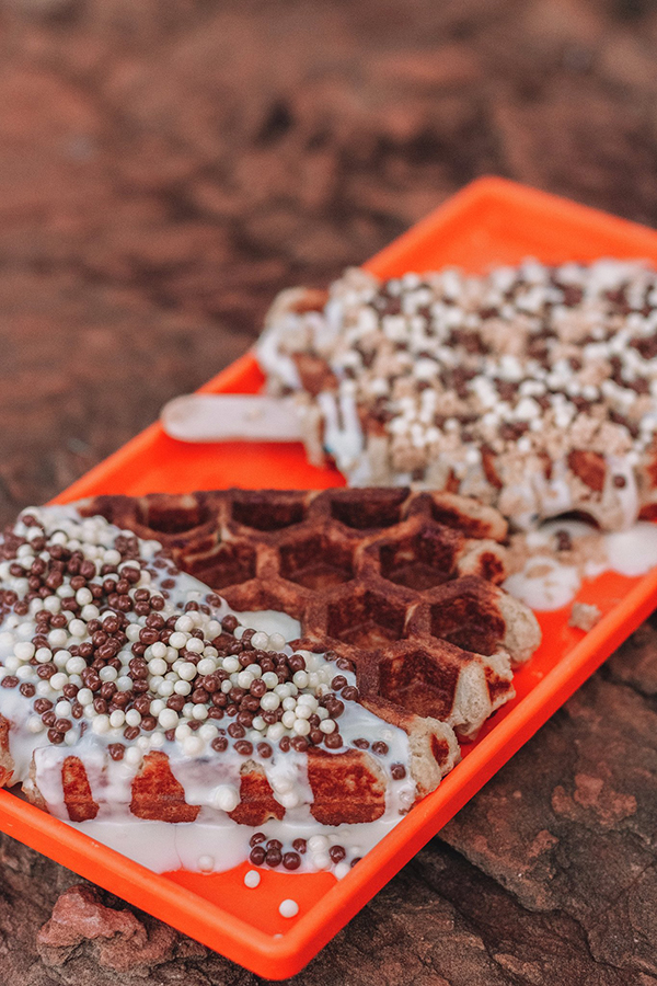 O Waffle no Palito salgado por si só já é uma delícia, mas o aroma de queijo pode ser incrementado com uma das opções de calda e uma de topping. Já o doce permite o acréscimo de um sabor de calda e dois de toppings. Há ainda a opção de uma bola de sorvete por mais R$ 5,00. As caldas apresentam sabor Doce de leite, Leite condensado, Trufa ao leite, Trufa branca e Nutella. Já os toppings, as seguintes opções: Confete, Castanha, Granulado colorido, Granulado preto e branco, Ovomaltine, Crocante colorido, Crocante preto e branco, Jujuba, Pingo de chocolate, Paçoca e Leite em pó.
