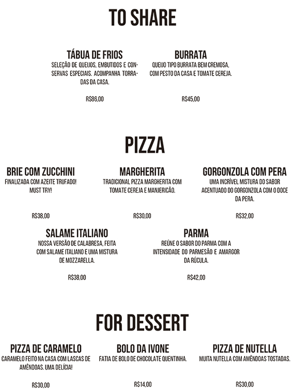 Os destaques são os hambúrgueres na massa de pizza. O Wine Burguer é feito com beef passion, bacon, queijo cheddar e cebola caramelizada, R$ 32,00. Já o Garden Burguer possui beef passion, shimeji, queijo emental e manjericão, R$ 34,00.