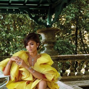 Zendaya, usando o relógio Octo Roma em ouro rosa dezoito quilates, comparece a um misterioso baile de máscaras e se apresenta como uma Eva moderna com uma maçã na mão em um jardim luxuoso, brilhando com diamantes da coleção Fiorever.